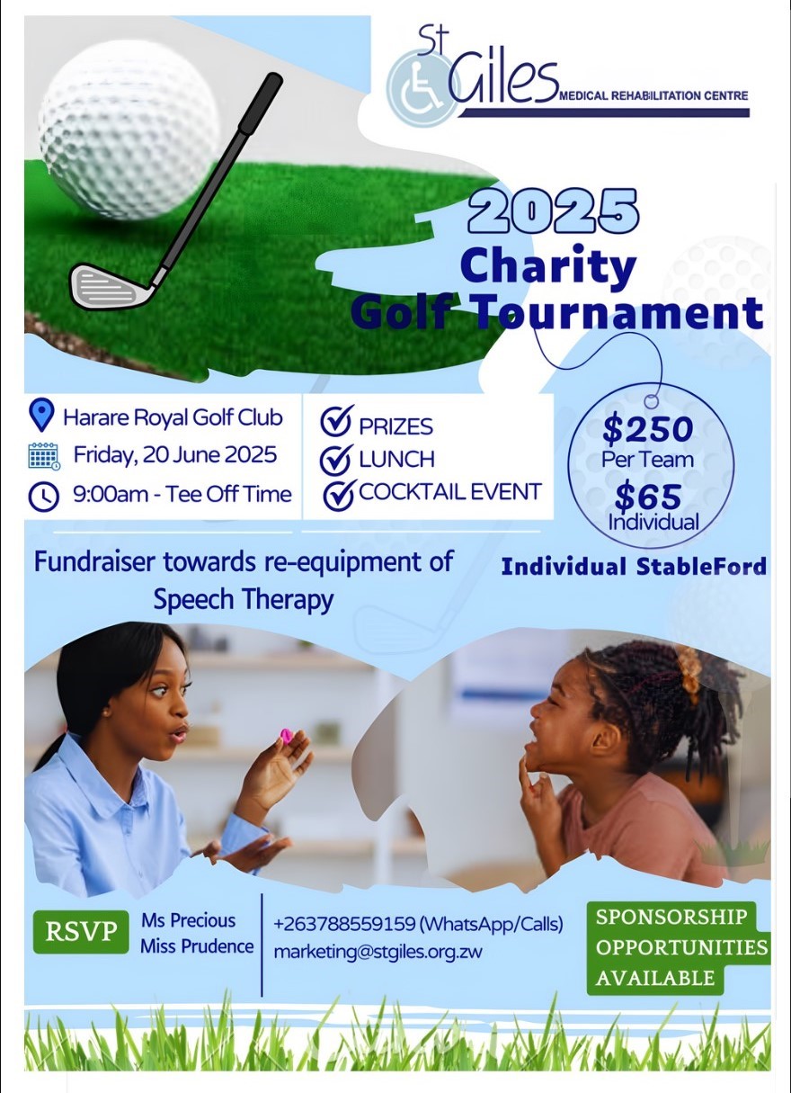 Join St Giles Medical Rehabilitation Centre for their 2025 Charity Golf Tournament at Harare Royal Golf Club on Friday, June 20, 2025, with a 9:00 AM tee-off. This fundraiser aims to re-equip Speech Therapy and includes prizes, lunch, and a cocktail event. Teams enter with $250, individuals $65. Contact Ms Precious or Miss Prudence for RSVP or marketing for sponsorship opportunities.